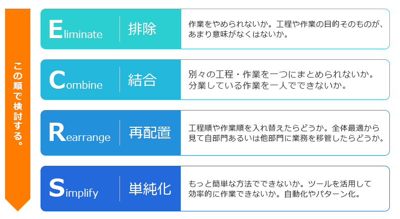 ECRSは、(1)Eliminate(排除)、(2)Combine(統合)、(3)Rearrange(順序入れ替え)、(4)Simplify(簡素化)の頭文字から取ったものです。